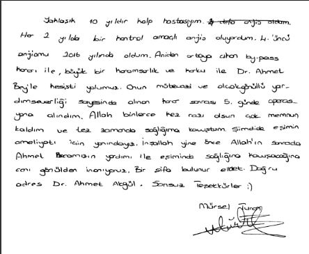 Tıp dünyasının bir bireyi olmayı başarabilenlere her zaman hayranlık ve saygı duymuşumdur. Çünkü onlar hayat kurtarırlar. Ama daha önce hiç rastlamadım ki, bir kalp ameliyatının sadece 13 gün sonrasında yaşadıklarını sadece birkaç günlük evden uzak ve lüks bir oteldeki tatil gibi anlatan biri olsun. Korkularımıza müzikler katan, ağrı ve korku yerine gülümseyerek anlattığı bir tatilin anıları gibi hikayeleri olan bir Bypass ameliyatı sürecini bizlere yaşatan Doç. Dr. Ahmet Akgül ve ekibi başta olmak üzere, Yoğun Bakım ve Kalp ve Damar Cerrahisi ekibinde yer alan tüm doktor, hemşire, hasta bakıcı olarak Tıp Dünyasına değer katan herkese teşekkürlerimizi sunmak istiyorum.