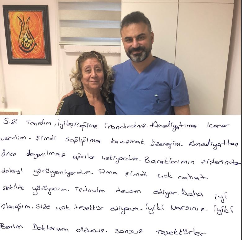 Sizi tanıdım, iyileştiğime inandırdınız. Ameliyatıma karar verdim. Şimdi sağlığıma kavuşmak üzereyim. Ameliyattan önce dayanılmaz ağrılar çekiyordum, Bacaklarımın şişlerinden dolayı yürüyemiyordum. Ama şimdi çok rahat şekilde yürüyorum. Tedavim devam ediyor, daha iyi olacağım. Size çok teşekkür ediyorum. İyi ki varsınız, iyi ki Benim Doktorum oldunuz. Sonsuz teşekkürler.