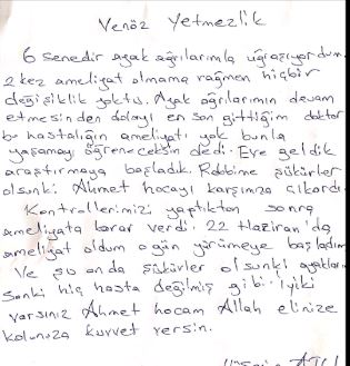 6 senedir ayak ağrılarımla uğraşıyordum. 2 kez ameliyat olmama rağmen hiçbir değişiklik yoktu. Ayak ağrılarımın devam etmesinden dolayı en son gittiğim doktor bu hastalığın ameliyatı yok bunla yaşamayı öğreneceksin dedi. Eve geldik araştırmaya başladık. Rabbime şükür olsun ki Ahmet hocayı karşımıza çıkardı.