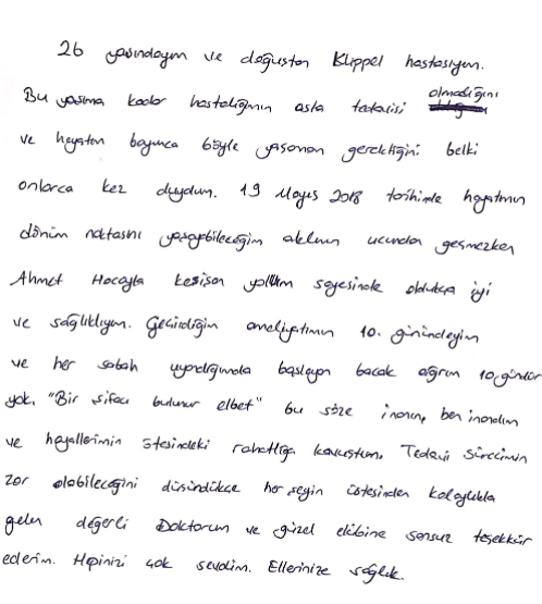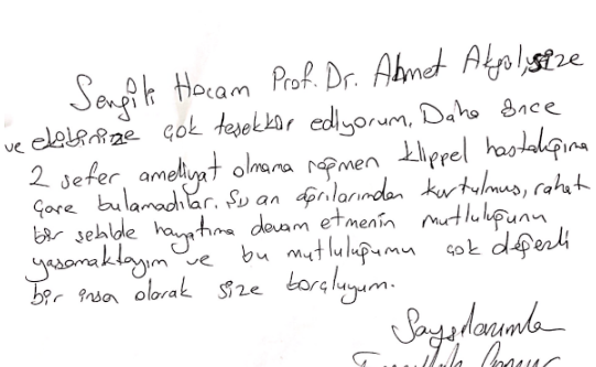 Sevgili Hocam Prof Dr Ahmet Akgül, size ve ekibinize çok teşekkür ediyorum. Daha önce 2 sefer ameliyat olmama rağmen Klippel hastalığıma çare bulamadılar. Şu an ağrılarımdan kurtulmuş, rahat bir şekilde hayatıma devam etmemein mutluluğunu yaşamaktayım ve bu mutluluğumu çok değerli bir insan olarak size borçluyum.