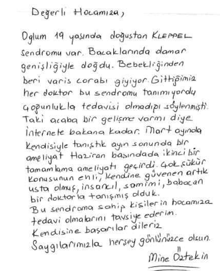 Büyük korkularla senelerdir çektiğim zorluk ve morluklarla size başvurdum. Sizin beni yönlendirmenizle önce ameliyata ikna oldum. Çünkü sadece bir doktor değil, çok da güzel bir insansınız. Ameliyat gecesi yürüyeceğimi söylediğinizde, gerçekten hiç inanmamıştım. Ama o gece en çok yaptığım şey yürümek oldu. Artık bembeyaz bacaklarım var, sinek ısırığı kadar ameliyat yaralarım var. Operasyon geçirdiğime başkalarının inanmamasına neden oluyor. Mutluyum, özgürüm umutluyum. Elinize sağlık. Allah sizin de karşınıza zor işleri kolaylaştıran biri çıkarsın. Sevgilerimle.
