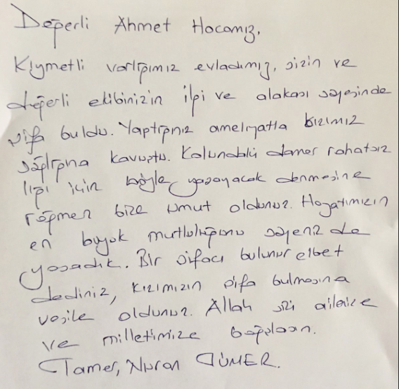 Kıymetli varlığımız evladımız, sizin ve değerli ekibinizin ilgi ve alakası sayesinde şifa buldu. Yaptığınız ameliyatla kızımız sağlığına kavuştu. Kolundaki damar rahatsızlığı için böyle böyle yaşayacak denmesine rağmen bize umut oldunuz. Hayatımızın en büyük mutluluğunu sayenizde yaşadık. Bir şifacı bulunur elbet dediniz, kızımızın şifa bulmasına sebep oldunuz. Allah sizi ailenize ve milletimize bağışlasın.