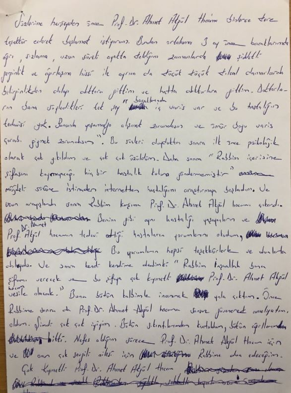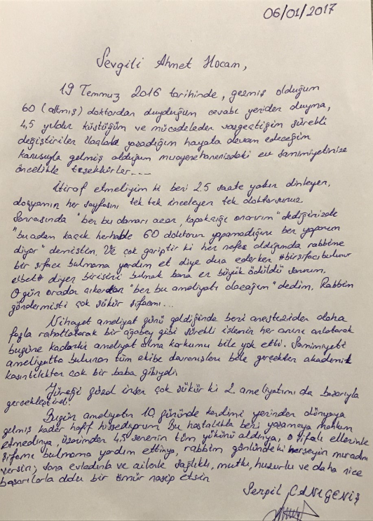 19 Temmuz 2016 tarihinde, gezmiş olduğum 60 (altmış) doktordan duyduğum cevabı yeniden duyma, 4,5 yıldır küstüğüm ve mücadeleden vazgeçtiğim sürekli değiştirilen ilaçlardan yaşadığım hayata devam edeceğim kanısıyla gelmiş olduğum muayenenizdeki ev samimiyetinize öncellikle teşekkürler.