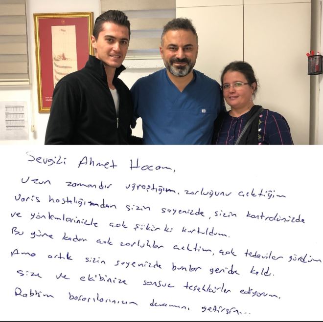 Öncellikle değerli hocam Ahmet Akgül size ve ekibinize çok teşekkürler. Allan sizden razı olsun önce oğlumu sonra beni iyileştirdiniz. Çaresizdik sizi çare oldunuz. Gitmediğimiz doktor kalmadı, hep olumsuzs, bilemediler. Allah kimseyi çaresiz bırakmasın, oğluma çok üzülüyordum ayakları şişiyordu, ağrısı oluyordu. Bir gün torunum "babaanne sana facebook açayım mı" dedi, "aç oğlum" dedim. Açtık, bakarken sizi gördüm, çok dikkatimi çekti. Aslında benim hiç internetle işim olmazdı ama sürekli hocamın başarılarını gördükçe hocama arkadaş isteği gönderdim, sağolsun kabul etti. "Dünyada ilk, Türk doktor yaptı" yazılı resmi gördüm. Torunuma "babanın ayaklarının resminin çek hocama gönderelim" dedim, gönderdik. Hocam da çağırdı, geldik. Allah şifamızı buradan verdi.