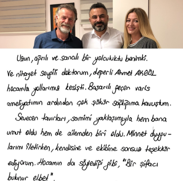 Uzun, ağrılı ve sancılı bir yolculuktu benimki. Ve nihayet sevgili doktorum, değerli Ahmet AKGÜL hocamla yollarımız kesişti. Başarılı geçen varis ameliyatımın ardından çok şükür sağlığıma kavuştum. Sevecen tavırları, samimi yaklaşımıyla hem bana umut oldu hem de ailemden biri oldu. Minnet duygularımı iletirken, kendisine ve ekibine sonsuz teşekkür ediyorum. Hocamın da söylediği gibi "Bir şifacı bulunur elbet"