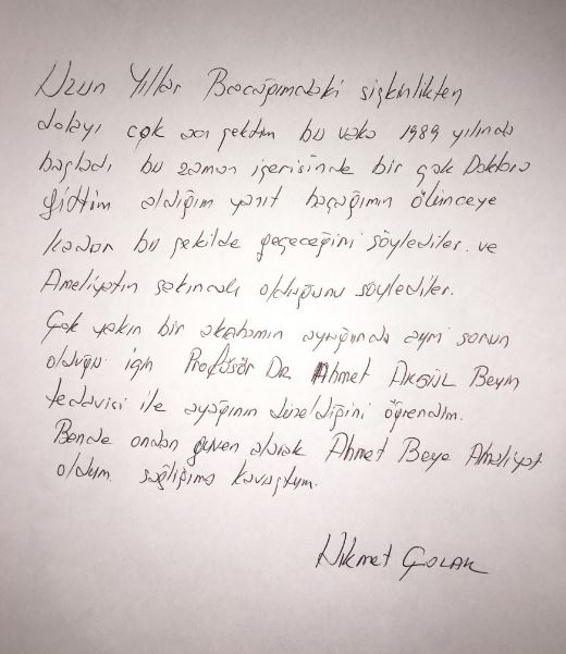 Her şeyden umudumu kesmişken Ahmet hocamı buldum. Beni muayene ettiğinde yapacağı tedavi ile tüm bu işkence gibi hastalıktan kurtulacağımı duyunca inanılmaz mutlu oldum. 10 günlük ameliyatsız yaptığı tedavi ile tekrar eski yürüyüşüme ve gece uykularına kavuştum. Ben bu zamana kadar sizin gibi güler yüzlü sıcak kanlı, işini ve mesleğini bu kadar seven bir insan görmedim. Tabi ekibinizi de unutmadım. Onlarda gayet sıcak kanlı ve ilgililer. Tedavi olmak için bir hastaneye gelmiyor insan, sanki arkadaşlarının yanına gelir gibi geliyor huzurla geliyor. Allah size sağlıklı uzun ömürler versin. Bu başarınız ömrünüzün sonuna kadar daim olsun. Sizi kısa sürede tanıdım. Ama İstanbul'a geldiğimde mutlaka görmek istediğim abimsiniz.