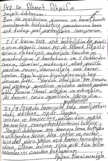 Sağlık personeli bir ameliyat için Türkiye ve İstanbul'daki tüm diğer cerrahlara ulaşabilirken bildiği ve emin olduğu için beni seçmesi ve hayatındaki en değerli varlık olan annesinin kalp ameliyatını bana emanet etmesi benim ve ekibim için onur vericidir.
